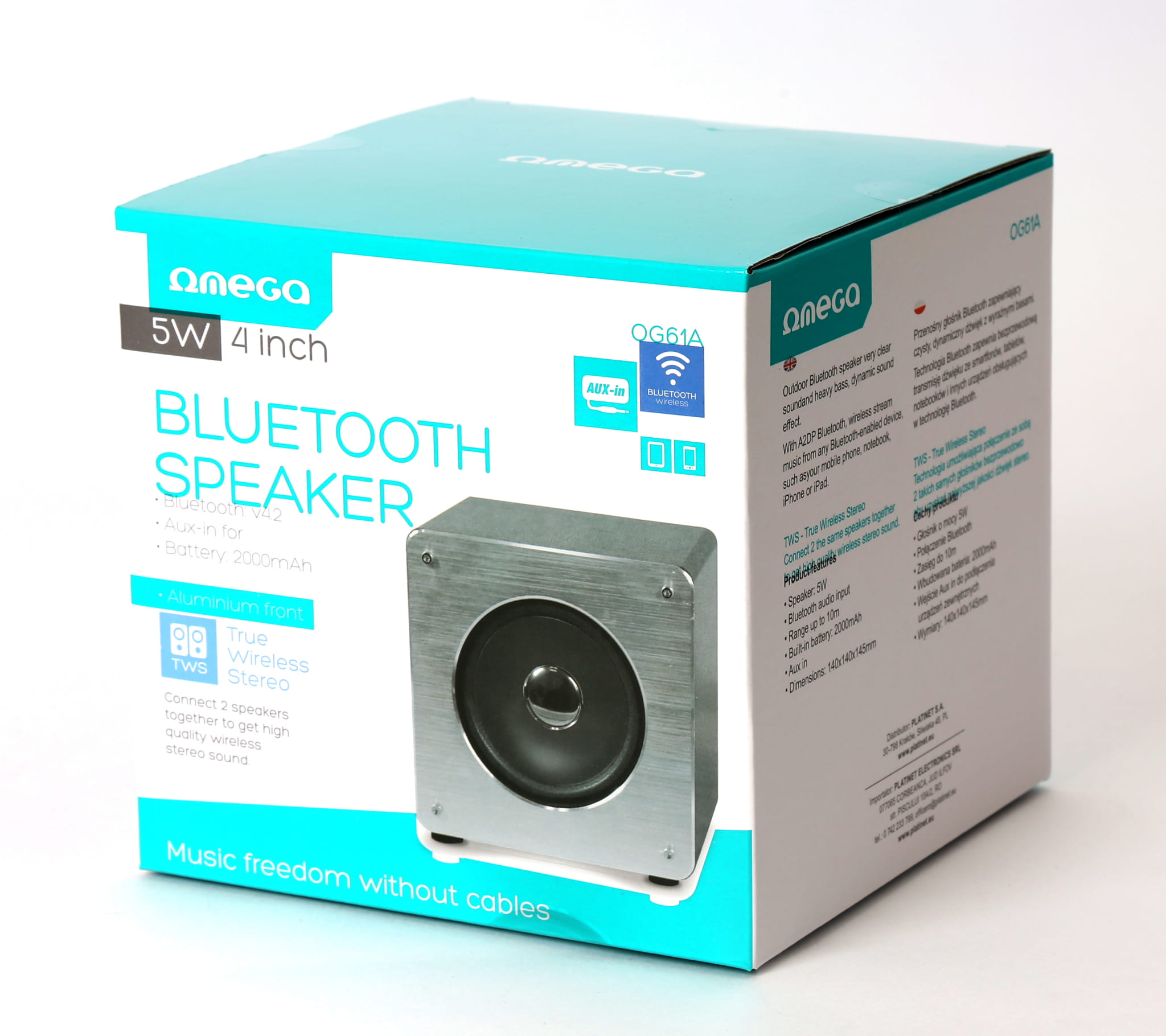 Omega OG61A is a Bluetooth speaker in a modern, aluminium case. Thanks to the True Wireless Stereo function, it is possible to wirelessly connect two speakers together, creating a stereo set.