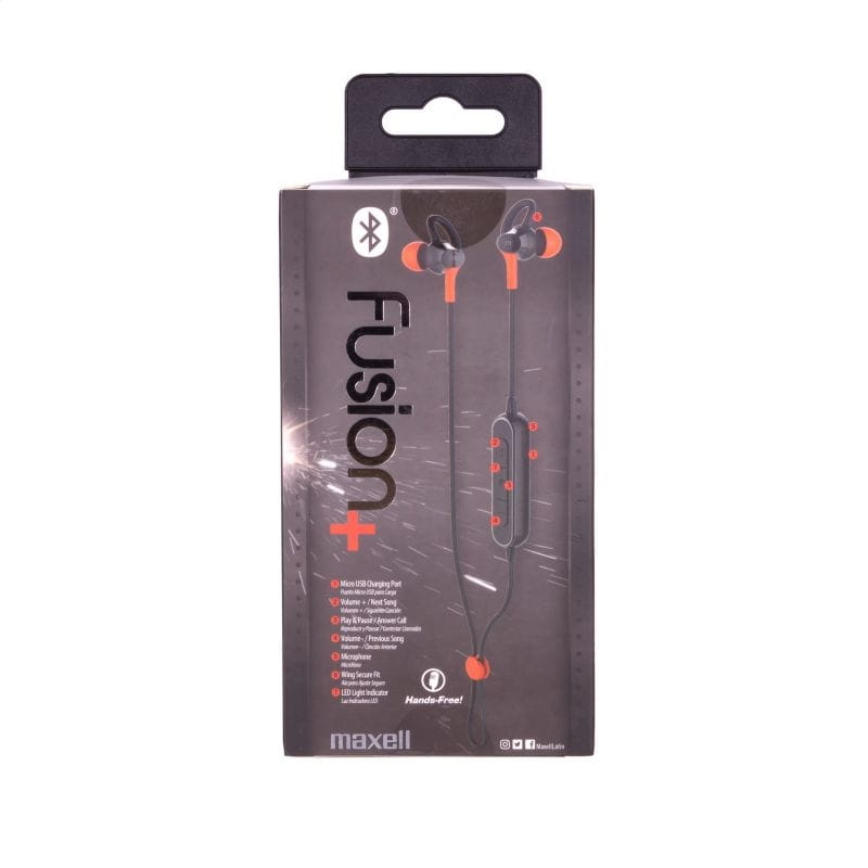Wireless headphones for active people Maxell EB-BTFUS9 FUSION + with microphone. Designed for runners. They have volume control on the remote control and a call answering / playback / pause button. Charging from the USB port Easier pairing thanks to the LED diode. Durable battery with 3,5h autonomy. Technical parameters: Impedance Ohm 16 Ohm Frequency response 20 Hz -20 KHz Sensitivity 102 dB Diameter of the loudspeaker 10 dB Built-in microphone yes Bluetooth version V4.2 Range up to 10m USB DC 5V Input power supply Battery life [h] 3.5 hours Charging time [h] 2.5 hours