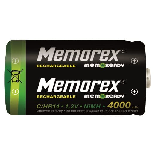 Memorex® - high performances - important cost savings! - Ready to use / already pre-charged - Very low self-discharge; suitable for all 1.5V devices - Up to 5 X more powerful than alkaline batteries when used in highdrain devices (digital cameras, MP3 players, …) - Compatible with all NiMH chargers - Rechargeable up to 1000 times Tech spec: Technology: NiMH Capacity: 4000mAh Size: R14/C Voltage 1,2V Packaging: blister 2 pieces 0% mercury, 0% cadmium