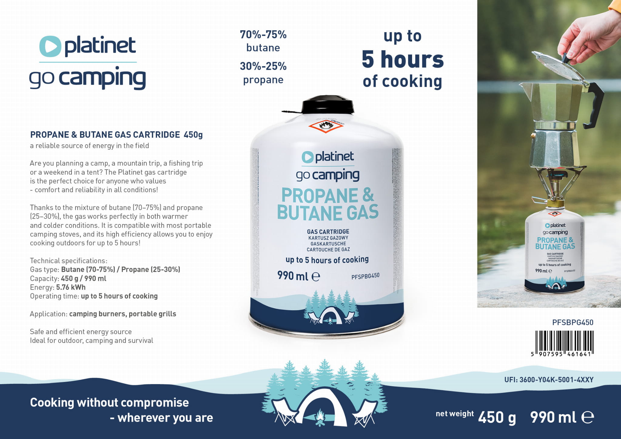 PLATINET BUTANE & PROPANE GAS CARTRIDGE CANISTER 450g 990 ml 5h [46164]