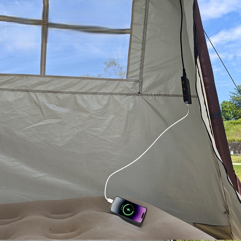 The tent is equipped with a 2000mAh / 7.4V / 14.8Wh battery and various output ports:
