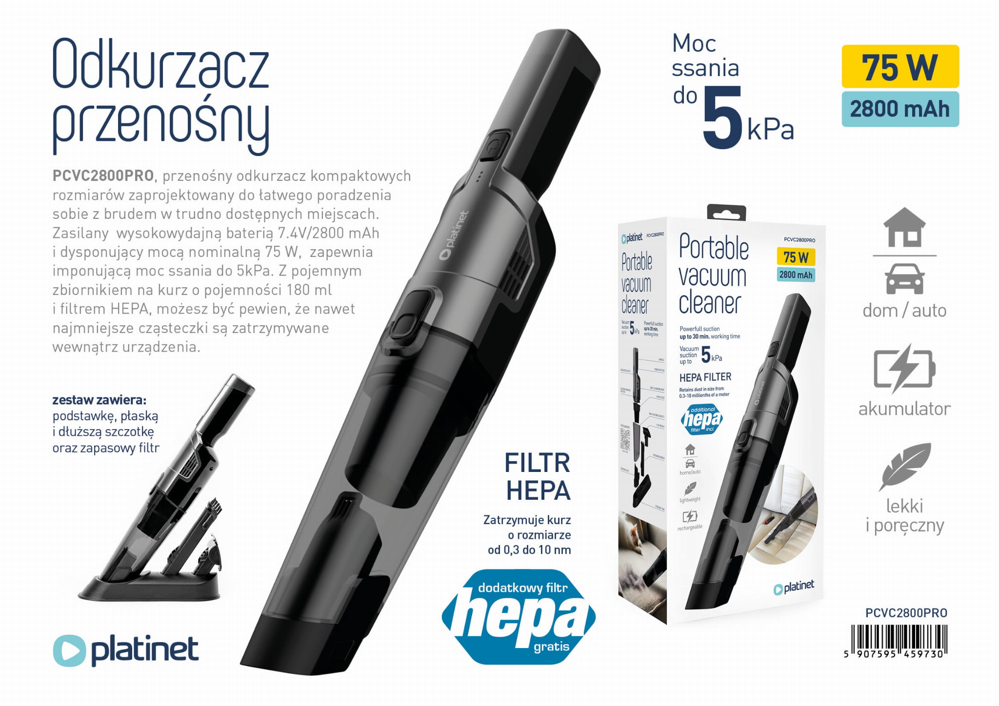 Thanks to the large dust container and Hepa filter, our vacuum cleaner effectively captures even the smallest impurities, ensuring clean and fresh air in your car.