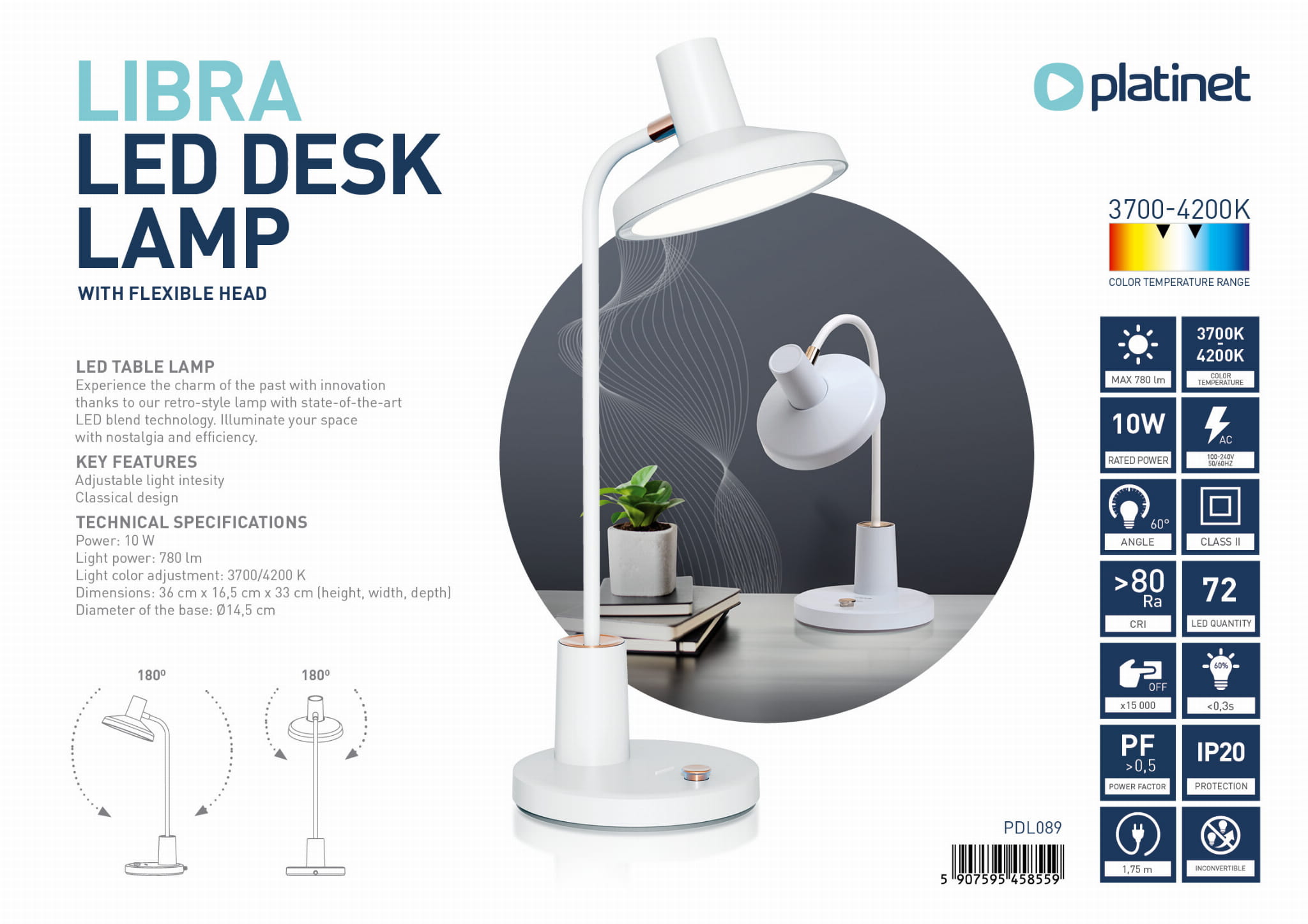 PLATINET DESK LAMP LIBRA LED 10W 780LM WHITE [45855]